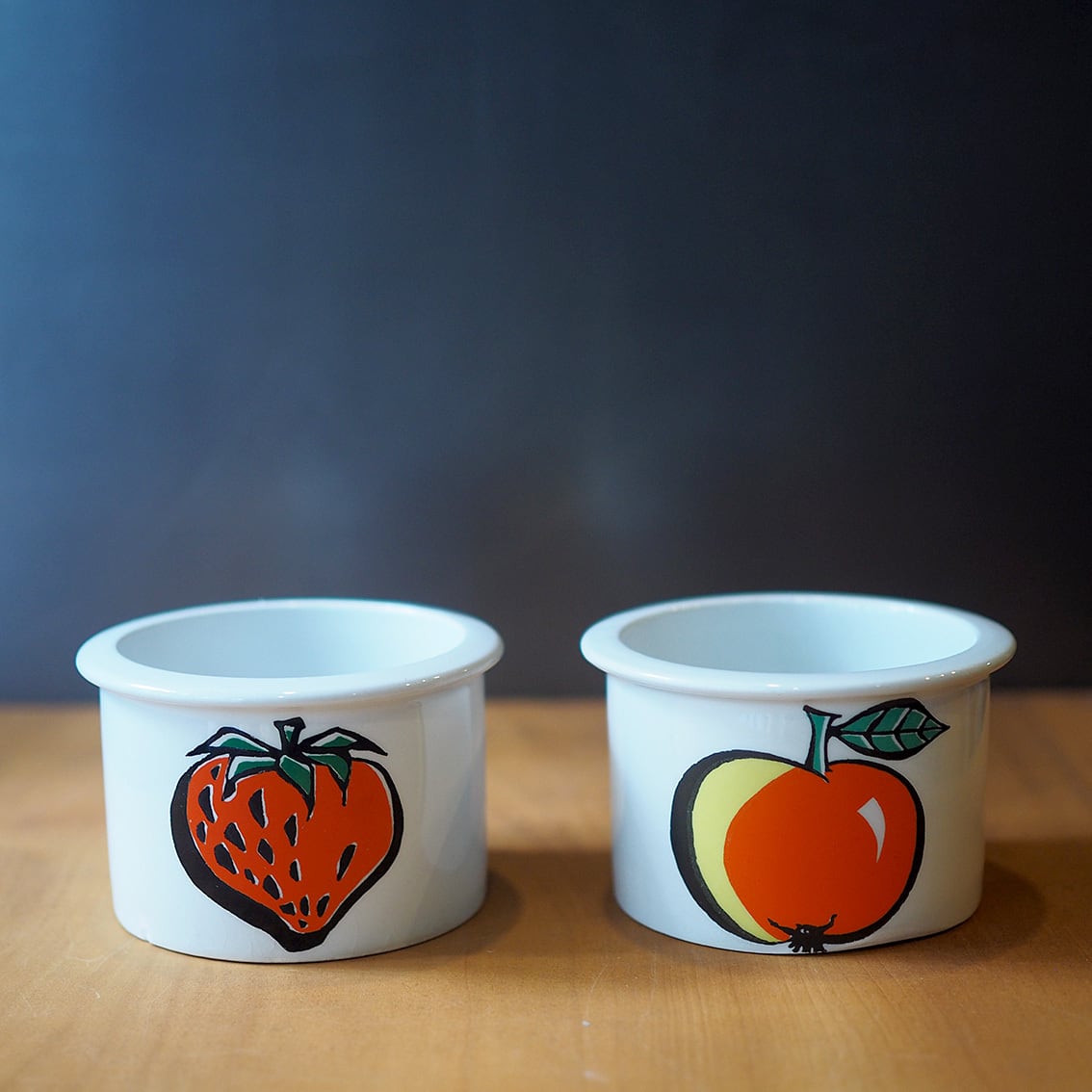 Raija Uosikkinen(ライヤ・ウォシッキネン)が手がけたカラフルでレトロな意匠が魅力のジャムポットです。北欧では、短い夏に収穫したいろいろな果実でジャムをつくり、長い冬の間の保存食として大切に食べる習慣があるそうです。そんな文化から生まれたこの〈Pomona〉は、ほかにもブルーペリー・リンゴベリー・プラム・コケモモ・オレンジ・はちみつなどの種類があり、フィンランドの家庭のキッチンで色とりどりのジャムを入れて並べられていたのを想像すると、あたたかい気持ちになります。こちらは見かけることが少ないシングルのいちご柄。フタはありませんが、スイーツやフルーツをサーブしたり、小物入れとして使ってもすてきです。最近ではコレクターアイテムになっている希少な商品ですが、すこしダメージがあるため価格を下げてご紹介します。