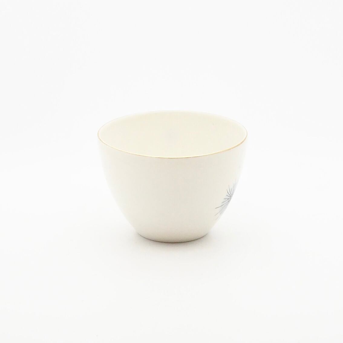 「木星」という意味の名前が付けられた「Jupiter(ユピテル)」シリーズ。まろやかな白地に、輝く惑星のような、ケセランパサランのような不思議な柄が描かれています。縁取りは繊細なゴールドがあしらわれ、最高神ゼウスをあらわす名のとおり、神秘的な雰囲気があります。スマートなフォルムで驚くほど軽く、扱いやすいサイズなのも魅力。こちらは、カップ&ソーサーにケーキプレートが付いた希少なトリオで、お茶の時間はもちろん、朝食に使っていただいてもすてきです。
