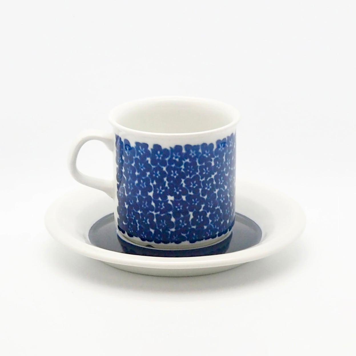 イタリアのFaenza(ファエンツァ)で開かれた国際陶芸展で金賞を受賞したのを記念に、その街の名前が付けられたシリーズです。鮮やかなブルーの小花が散りばめられた可憐なデコレートはInkeri Seppala(インケリ・セッパラ)によるもの。かわいらしいけれど洗練されていて甘すぎないデザインが見事です。1970年代のARABIAヴィンテージらしさが満喫できるレトロモダンなカップ&ソーサーは、食卓をぱっとあかるく心地いい空間にしてくれる名作です。こちらはソーサーにわずかなヒビが見られますので、価格を下げてご紹介します。