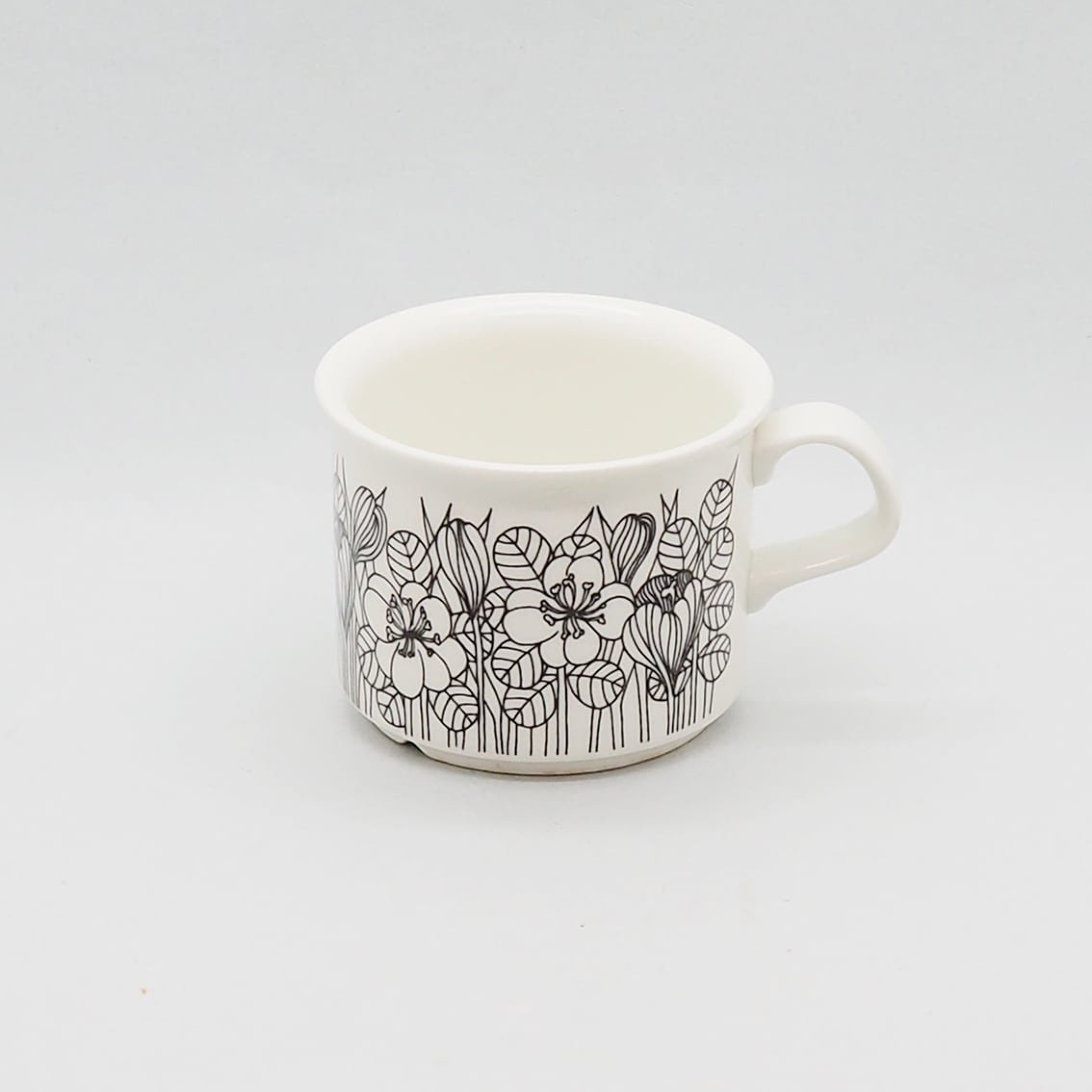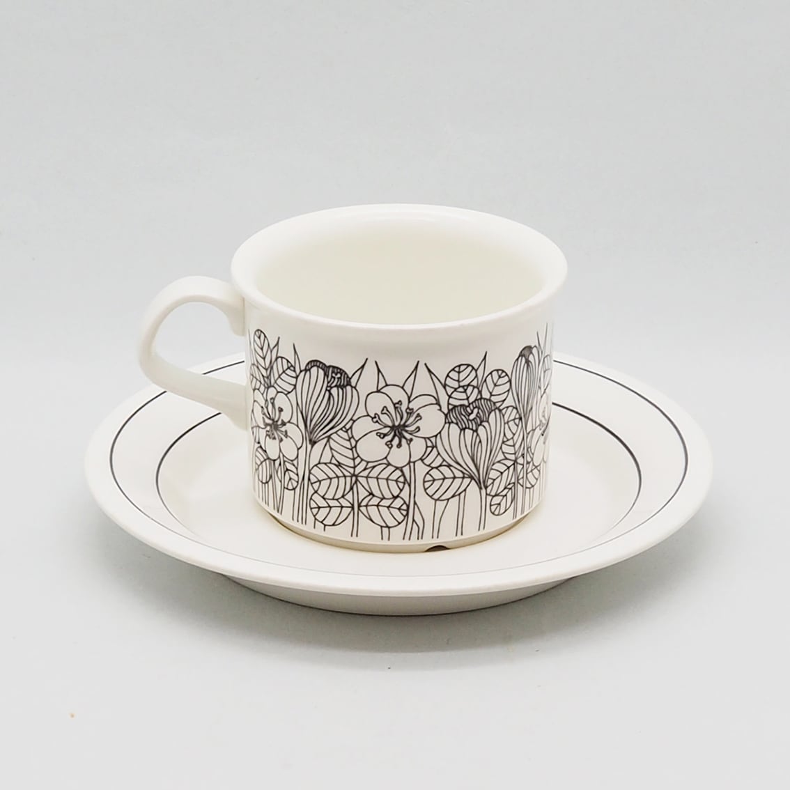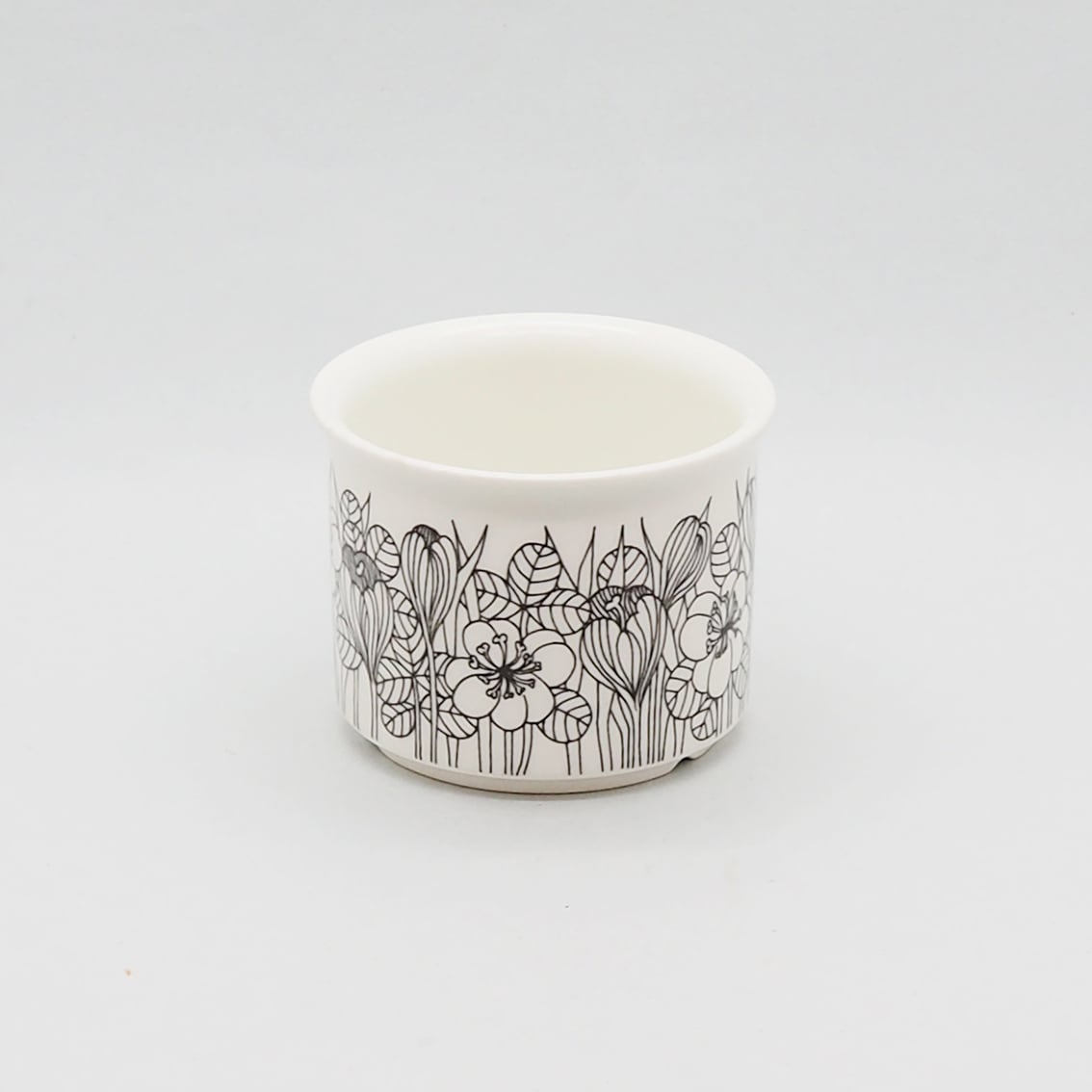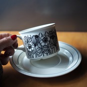 繊細かつ大胆な植物モチーフのデコレートを数多く手がけたエステリ・トムラの代表作のひとつ、「クロッカス」。北欧の春の訪れを告げるクロッカスの花が表情豊かに描かれ、長い冬を乗り越えたフィンランドの人々の喜びが伝わってくるようです。「クロッカス」は伝説ともいえる人気の高さから、現在マグやプレート類が復刻版として販売されていますが、カップ&ソーサーはヴィンテージのオリジナルだけ。こちらはシックな白黒版のコーヒーサイズで、1978年から2年間のみ製造された作品です。