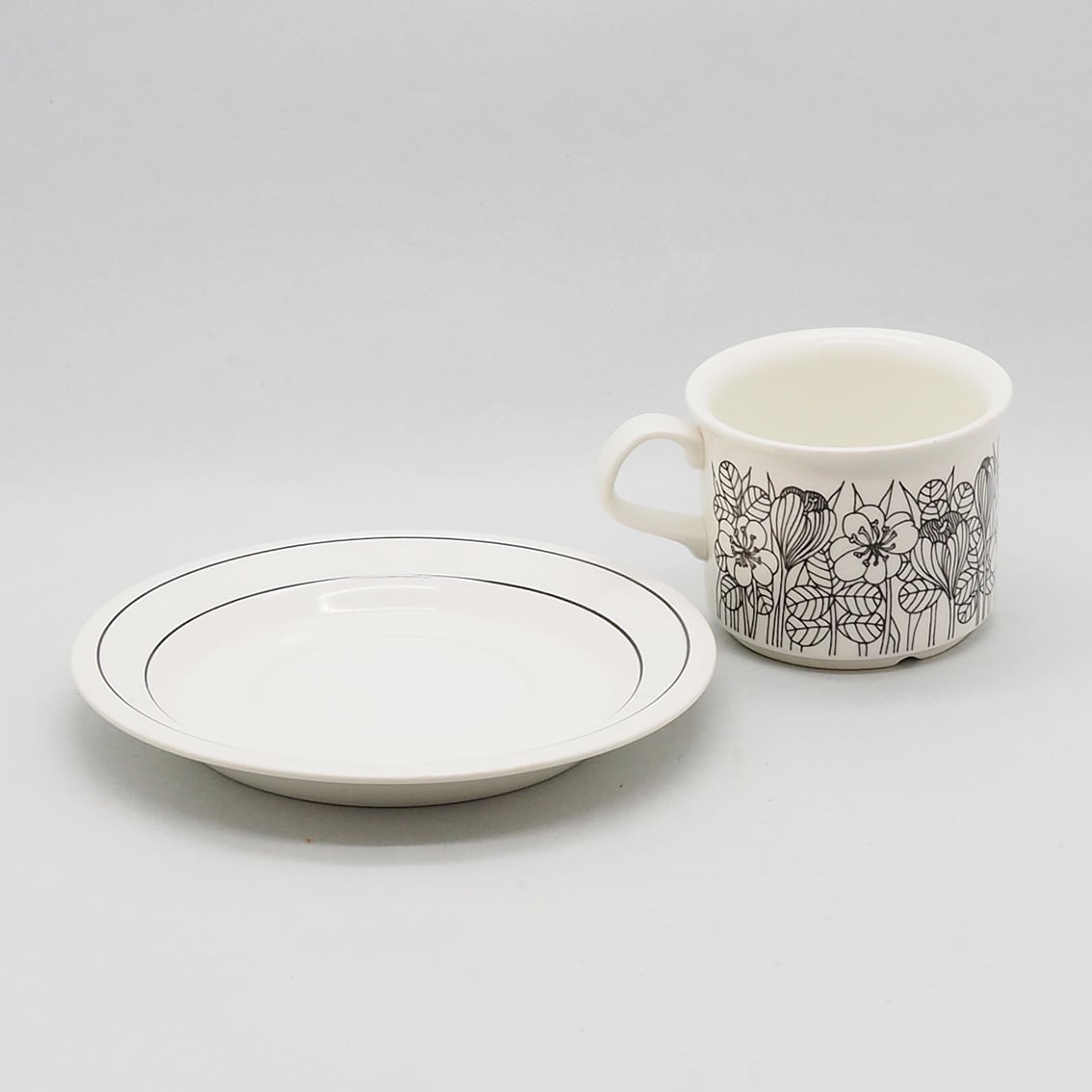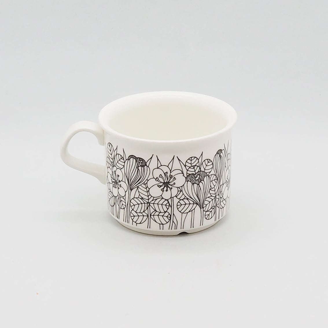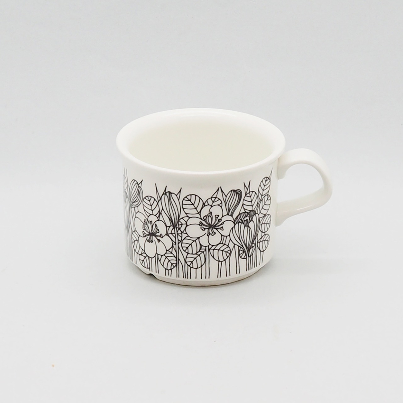 繊細かつ大胆な植物モチーフのデコレートを数多く手がけたエステリ・トムラの代表作のひとつ、「クロッカス」。北欧の春の訪れを告げるクロッカスの花が表情豊かに描かれ、長い冬を乗り越えたフィンランドの人々の喜びが伝わってくるようです。「クロッカス」は伝説ともいえる人気の高さから、現在マグやプレート類が復刻版として販売されていますが、カップ&ソーサーはヴィンテージのオリジナルだけ。こちらはシックな白黒版のコーヒーサイズで、1978年から2年間のみ製造された作品です。